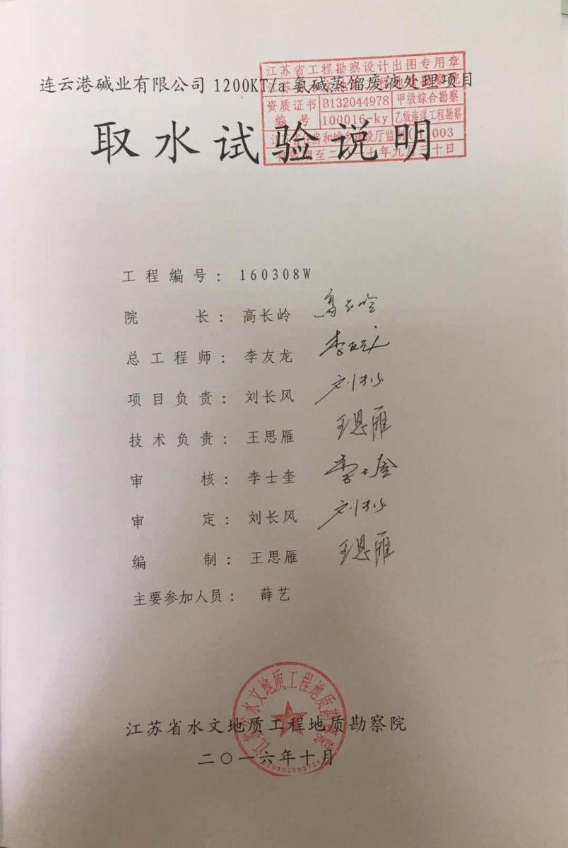 根據(jù)吉林化學工業(yè)公司設計院《連云港堿廠環(huán)境影響報告書》和原江蘇省環(huán)境保護局《關于對連云港堿廠環(huán)境影響報告書的批復》(蘇環(huán)管〔86〕31號)的要求,連云港堿廠產(chǎn)生的廢液送至渣場,經(jīng)澄清后,上清液經(jīng)自有排口閘直接排海。1997年,根據(jù)淮河流域水污染防治的要求,連云港市環(huán)保局向連云港堿廠下達了《關于淮河流域水污染源限期達標排放的決定》(連環(huán)管〔1997〕16號)。據(jù)此,連云港堿廠與臺北鹽場合作開發(fā)了“堿渣場上清液回收利用工程”項目,利用上清液制鹽、制鈣。1998年3月27日,該項目通過連云港市環(huán)保局組織的環(huán)保驗收,正式運行。