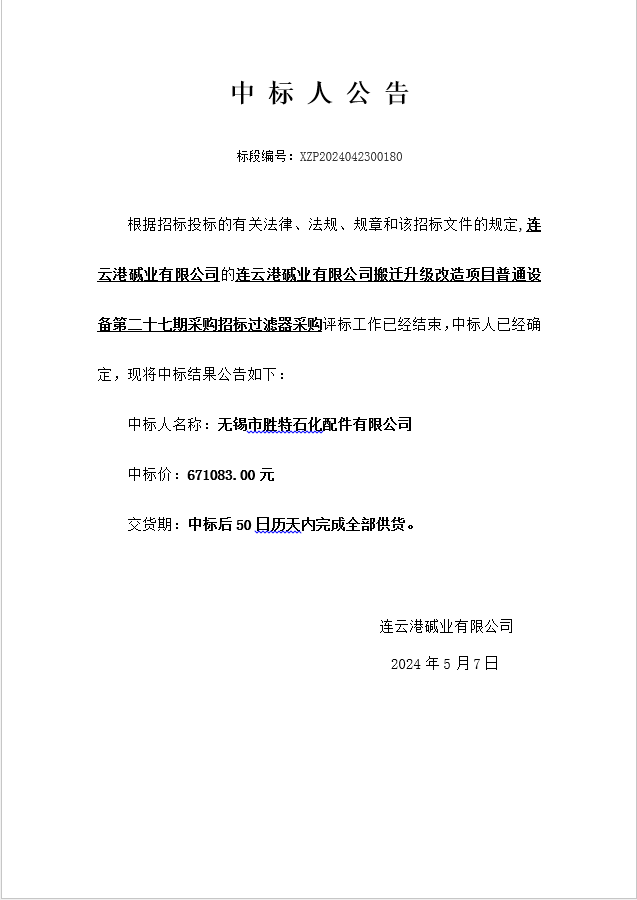 搬遷升級改造項目普通設(shè)備第二十七期采購招標過濾器采購中標人公告