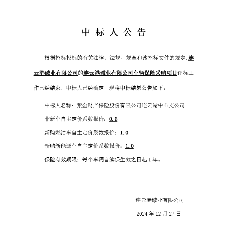 連云港堿業(yè)有限公司車輛保險采購項目中標人公告
